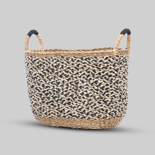 Elevate your home organisation with this beautifully crafted monochrome storage basket. Masterfully handwoven from natural seagrass and jute, this laundry hamper combines timeless style with practical functionality. The striking black and natural colour pattern creates an intricate woven design that adds visual interest to any room while maintaining a sophisticated aesthetic. The basket features sturdy, easy-grip handles wrapped in coordinating materials, making it convenient to transport laundry or other items. The generous size provides ample storage space, while the robust construction ensures durability for everyday use. The natural materials create a textural element that complements both modern and traditional décor schemes. Perfect for laundry storage, this versatile basket can also serve as an attractive solution for storing blankets, toys, or other household items. Each piece showcases the distinctive characteristics of handcrafted workmanship, making it a unique addition to your home.